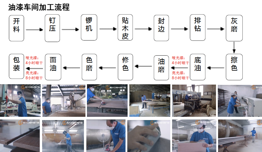 Board Cutting, Pressing, Curving, Veneer, Edge Banding, Drilling, Grinding, Coloring, Oil Painting, Second Grinding, Second Coloring, Second Coloring, Inspecting, Packing